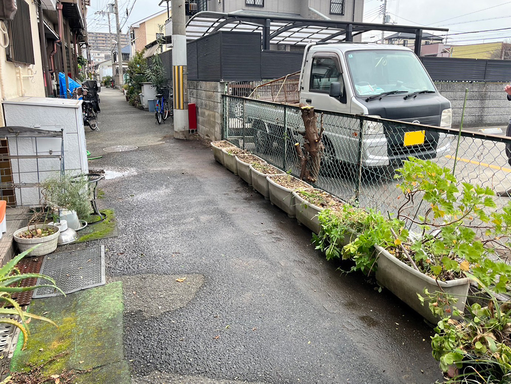 生活道路に並べた大量の植木鉢の撤去処分と実生の木の伐採|大阪府松原市